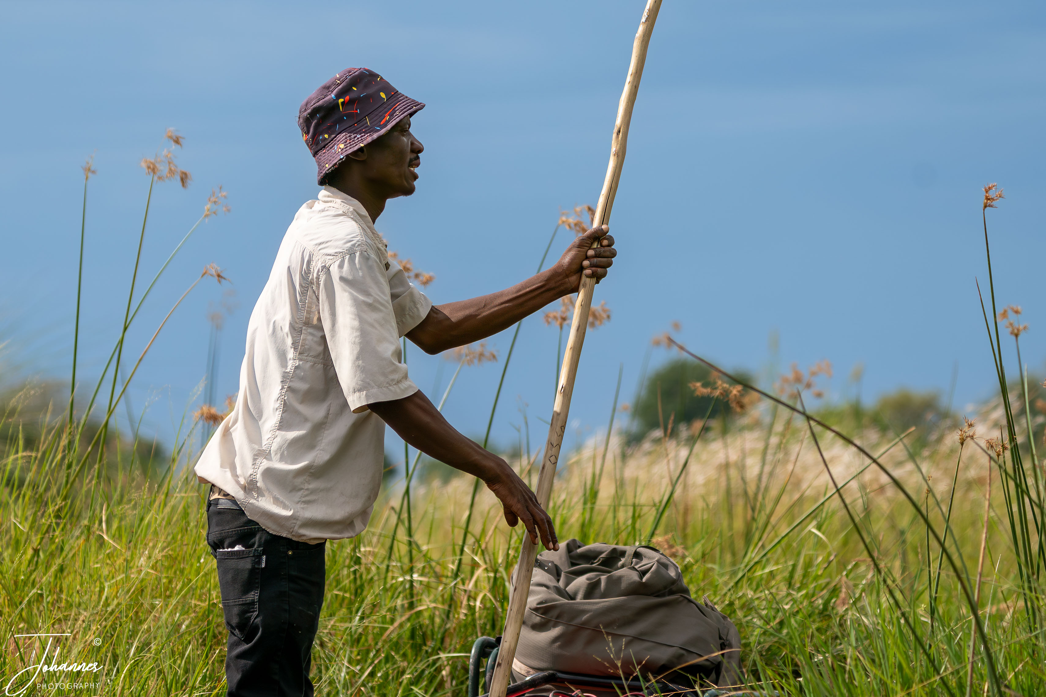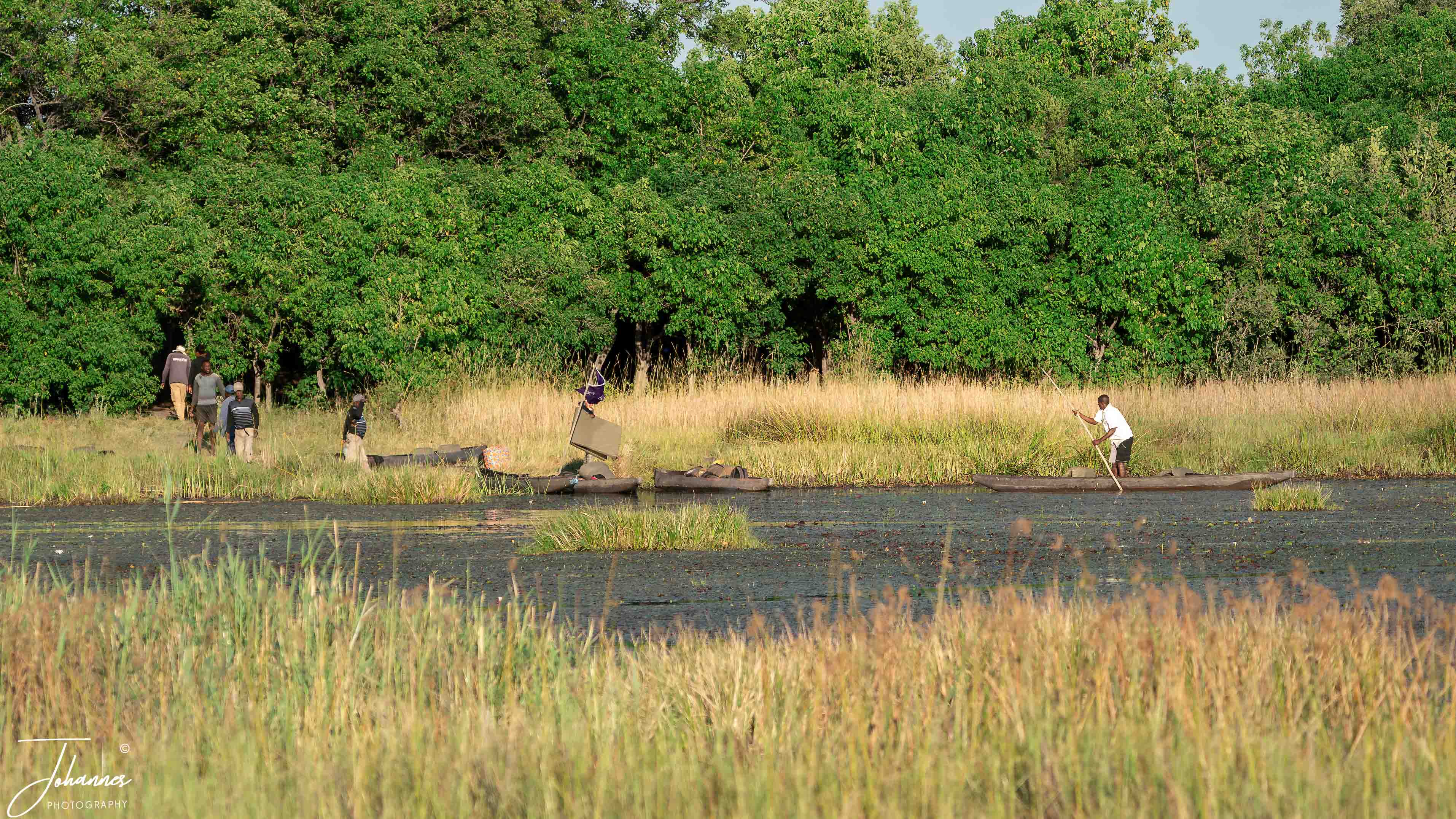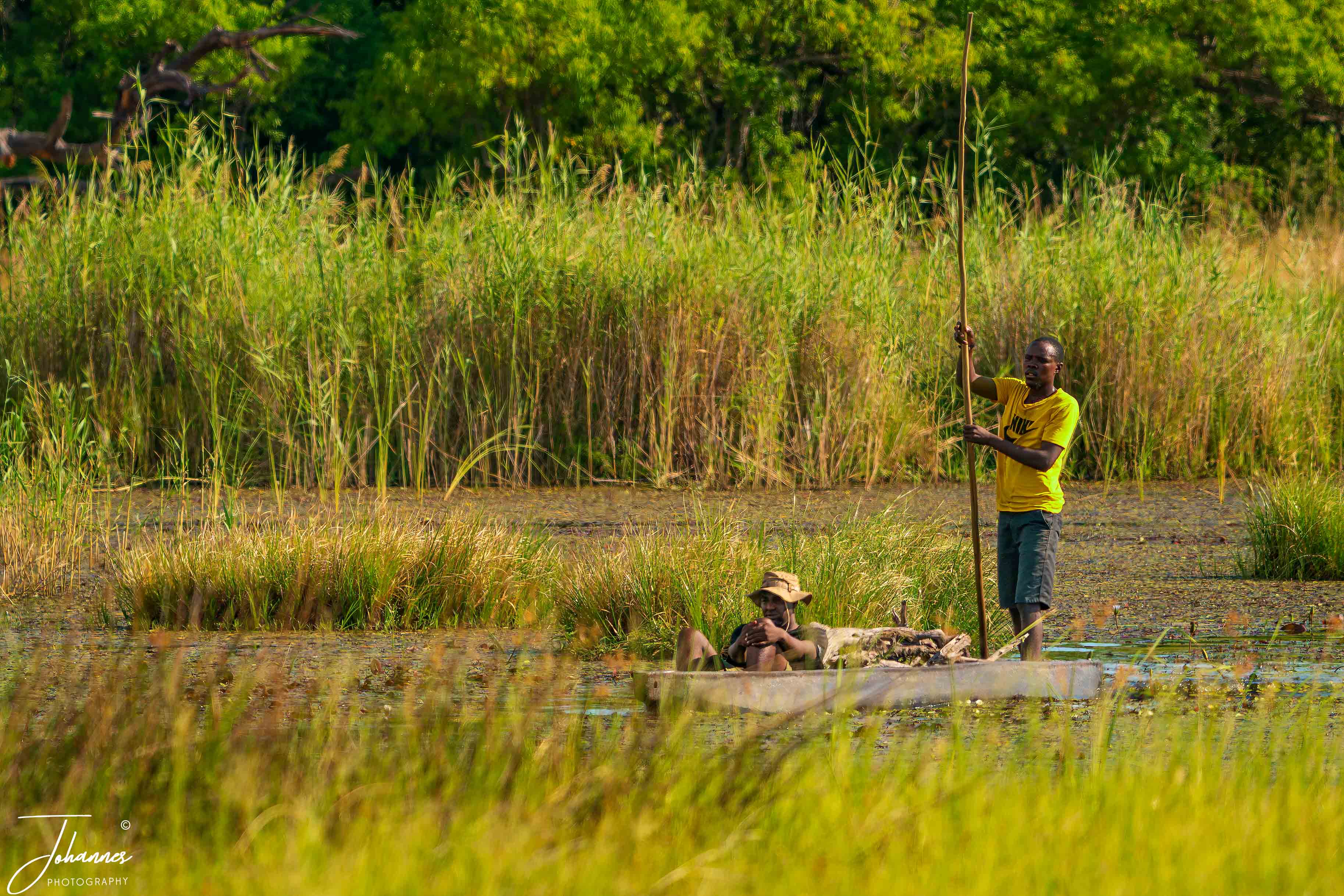 After four days in Moremi, we moved on to the Okavango Delta. Here, we traveled by mokoro—traditional dugout boats guided by “polers.” These polers stand at the back and use long poles to push the boat forward. Even though it was technically the rainy season, the water levels were quite low, and the poles regularly scraped the bottom. It’s fascinating to know that the water travels all the way from the north and takes six months to reach the Delta.